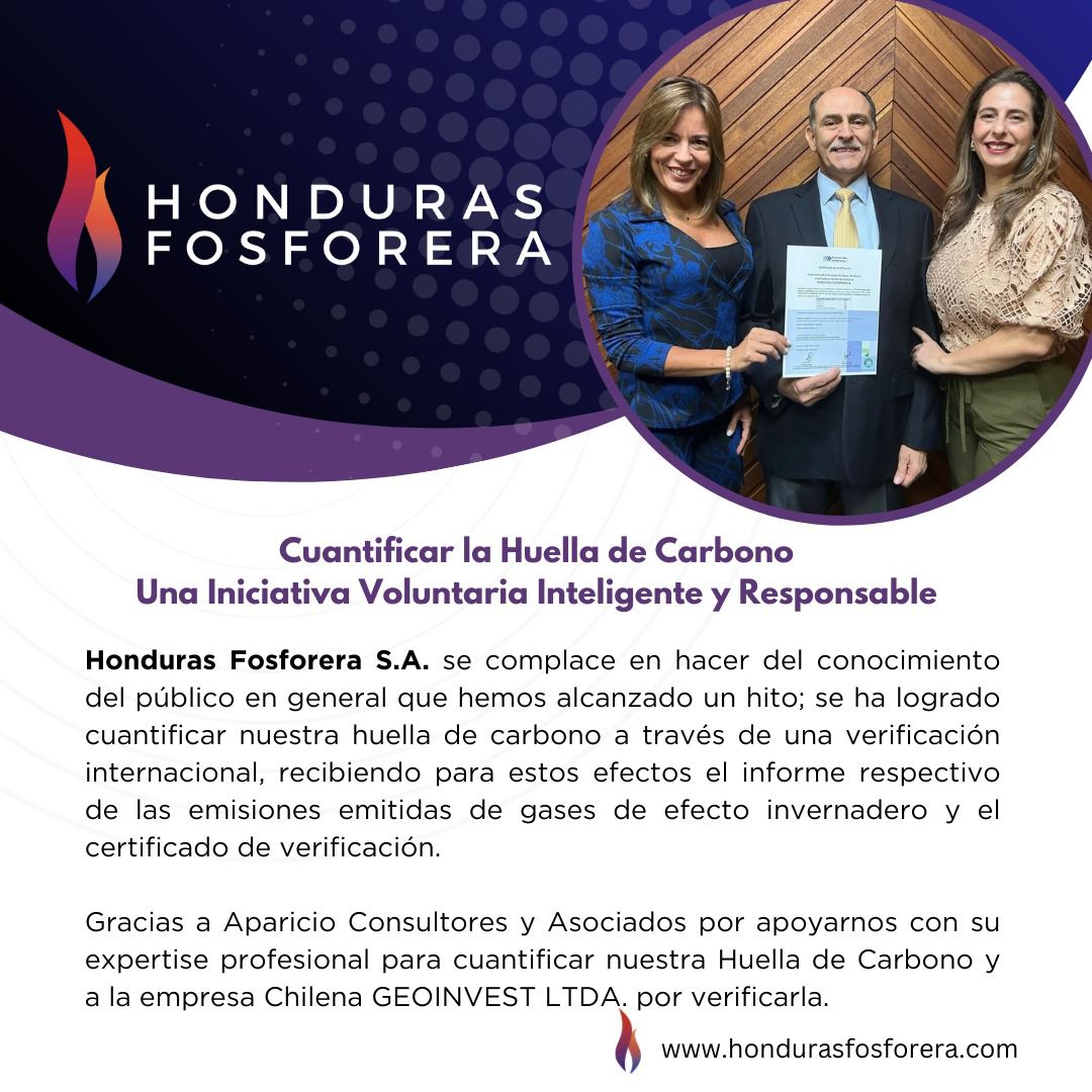 La empresa Honduras Fosforera localizada en la ciudad de Tegucigalpa, ha sometido su cuantificación de Huella de Carbono según ISO 14064:1 a la verificación de segunda parte a través de GeoInvest Limitada. Un hito de nuestra empresa en la internacionalización de nuestros servicios. La noticia fue publicada en los medios locales y en el sitio web de nuestro cliente. Seguimos abriendo espacios, buscando nuevas oportunidades de apoyo a empresas que están apoyando la sustentabilidad en América.
